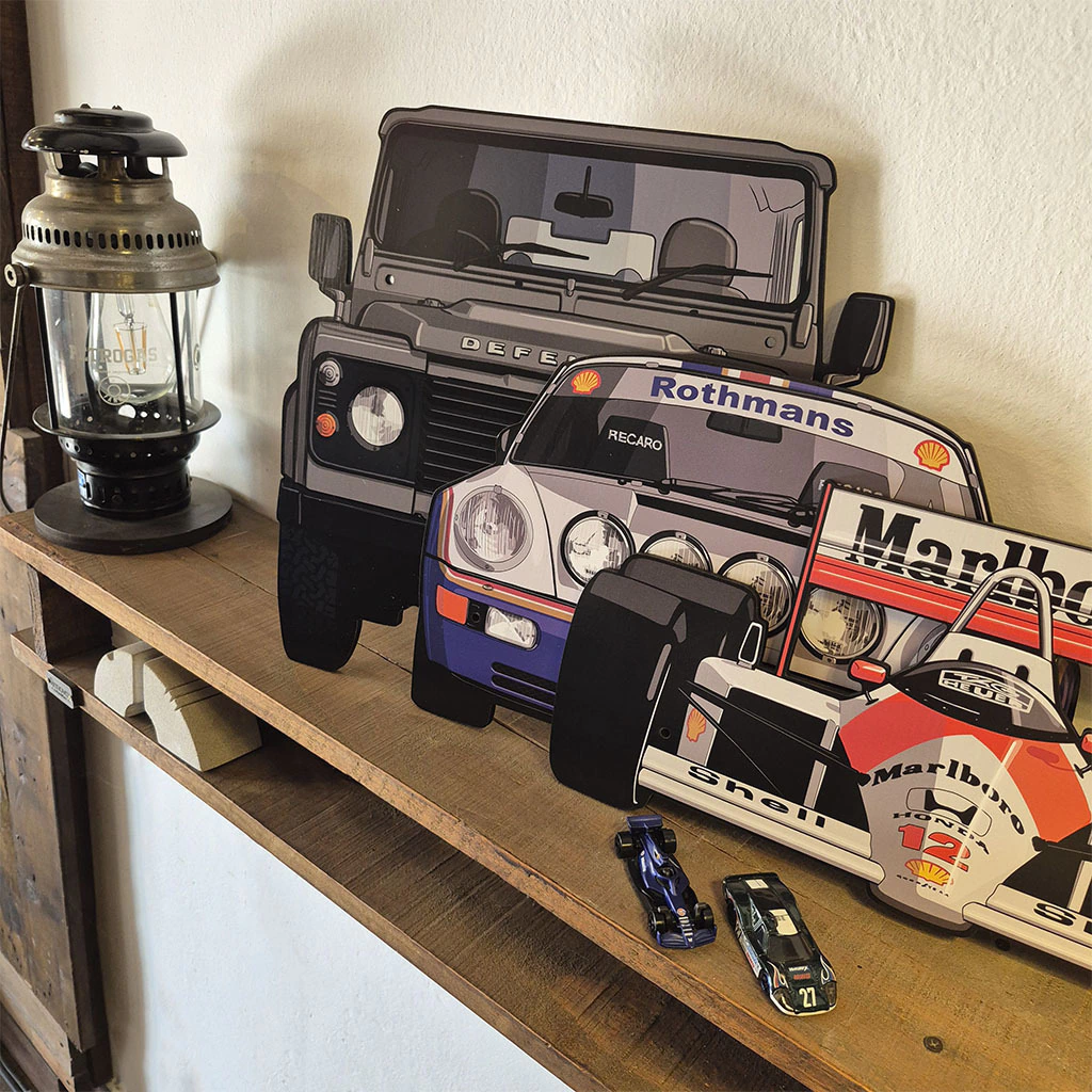 Cartel decorativo con ilustraciones exclusivas de autos en escala 1:5. Impreso en alta calidad y montado en madera de 5 mm.
